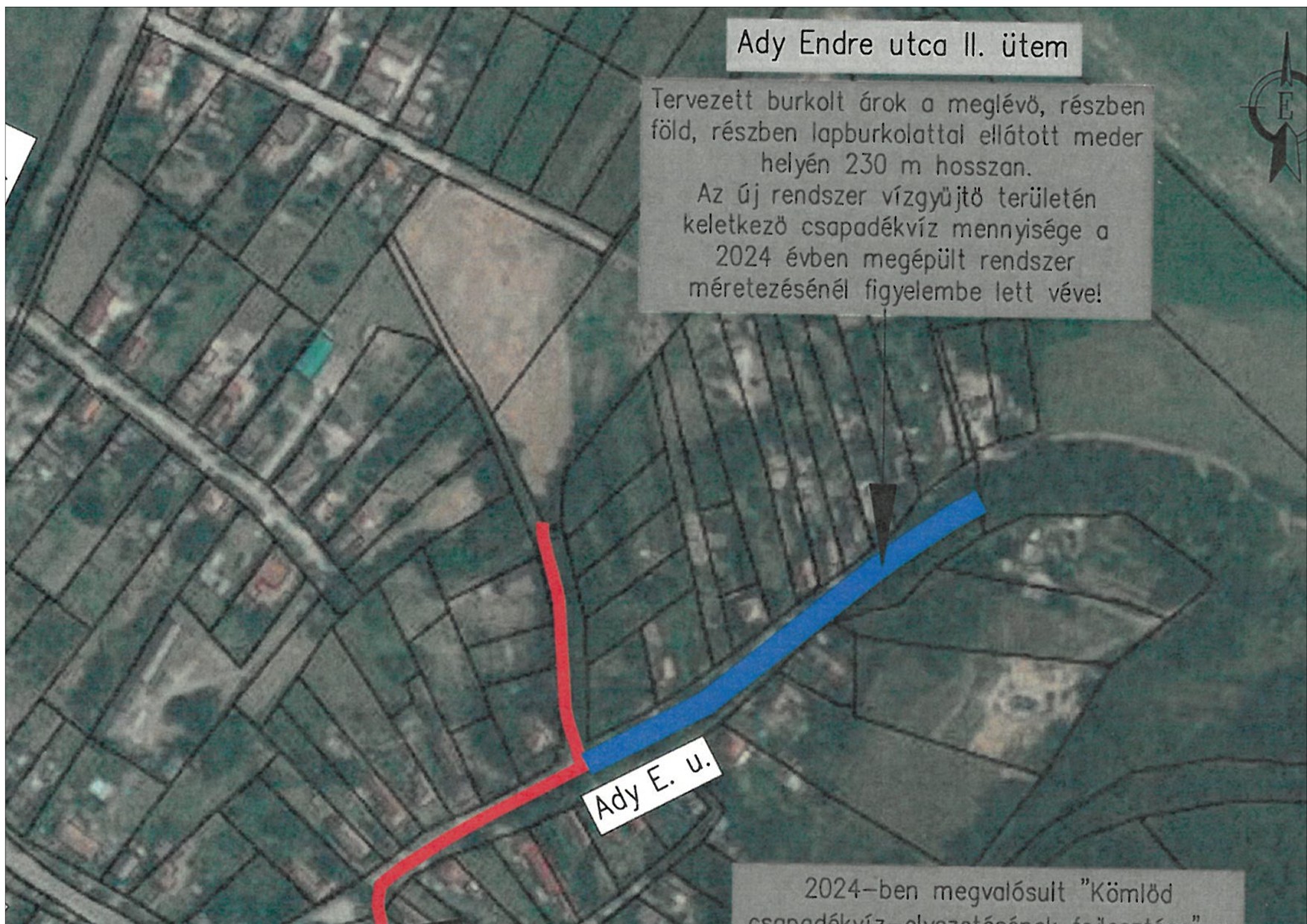 Folytatódhatnak az Ady Endre utca csapadékvíz elvezetésének munkálatai. A TOP PLUSZ program keretében 18.000.000 forint felhasználásával, a Magyar Kormány támogatásával megépülhet az utca felső szakaszának esővíz elvezető árokrendszere. A tervezők már elkezdték a munkát és május végére el is készülnek a kivitelezési tervek. Az engedélyeztetési eljárás remélhetőleg nem fog túlzottan elhúzódni és akkor a közbeszerzési eljárás lezárultával a kivitelezés is megindulhat. Ha minden összejön, akkor ebben az évben már el is készülhet a beruházás. Ennek a munkának elkészültével teljessé válik Kömlődön a veszélyes villámárvizek kezelése. Mint mindenki tudja a Kömlődi vízfolyás és az Ady Endre utca volt a legveszélyeztetettebb terület. Ezt jól átgondolt szervezéssel, pályázati lehetőségek megtalálásával és azok felhasználásával tudtuk elvégezni. Köszönet mindenkinek, aki ebben segített nekünk kömlődieknek.